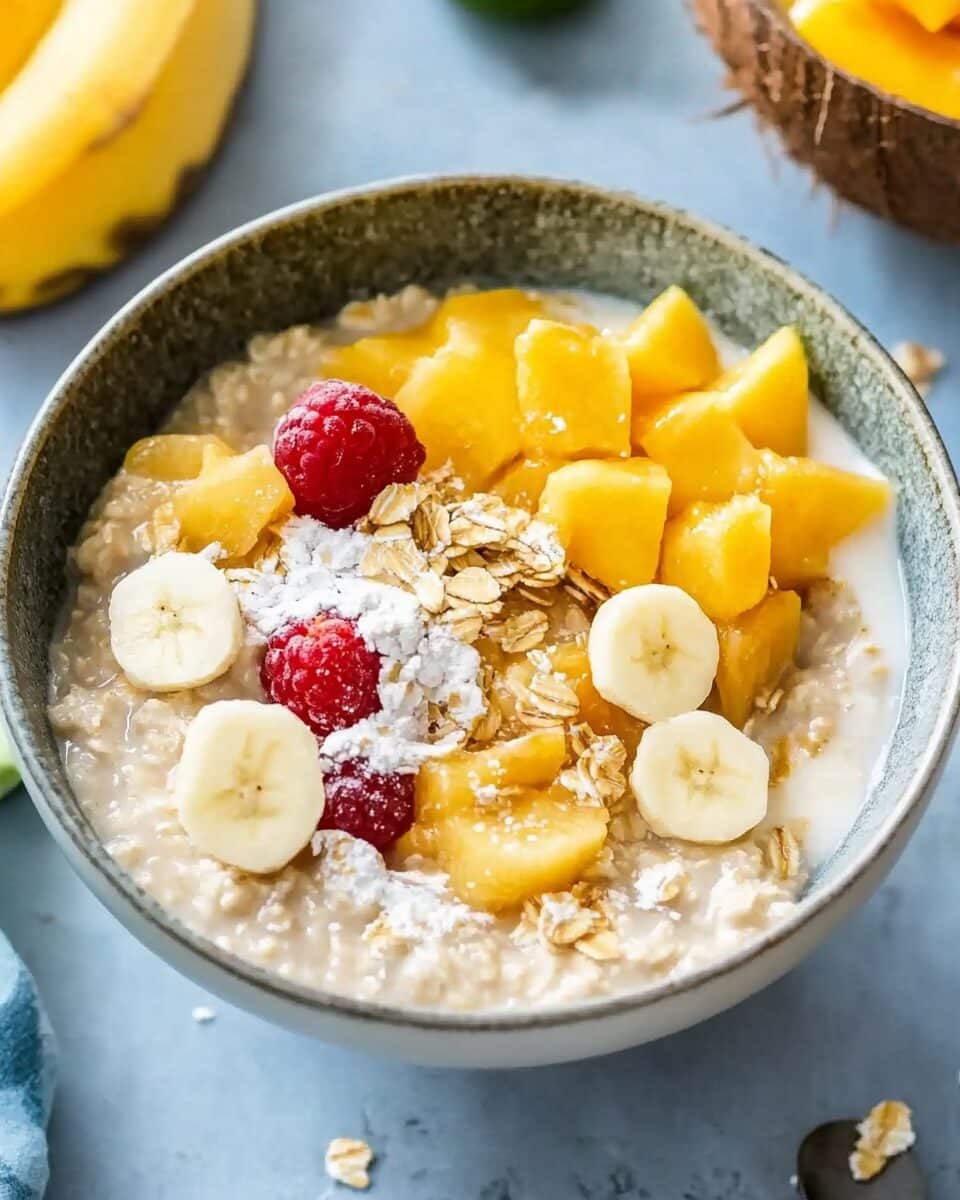 Tropical Coconut Oatmeal is more than just a breakfast; it’s a tropical getaway in a bowl. The combination of creamy coconut milk, hearty oats, and refreshing tropical fruits makes this dish both delicious and nutritious. Packed with fiber, healthy fats, and protein, it’s a perfect way to start your day on a healthy note.
